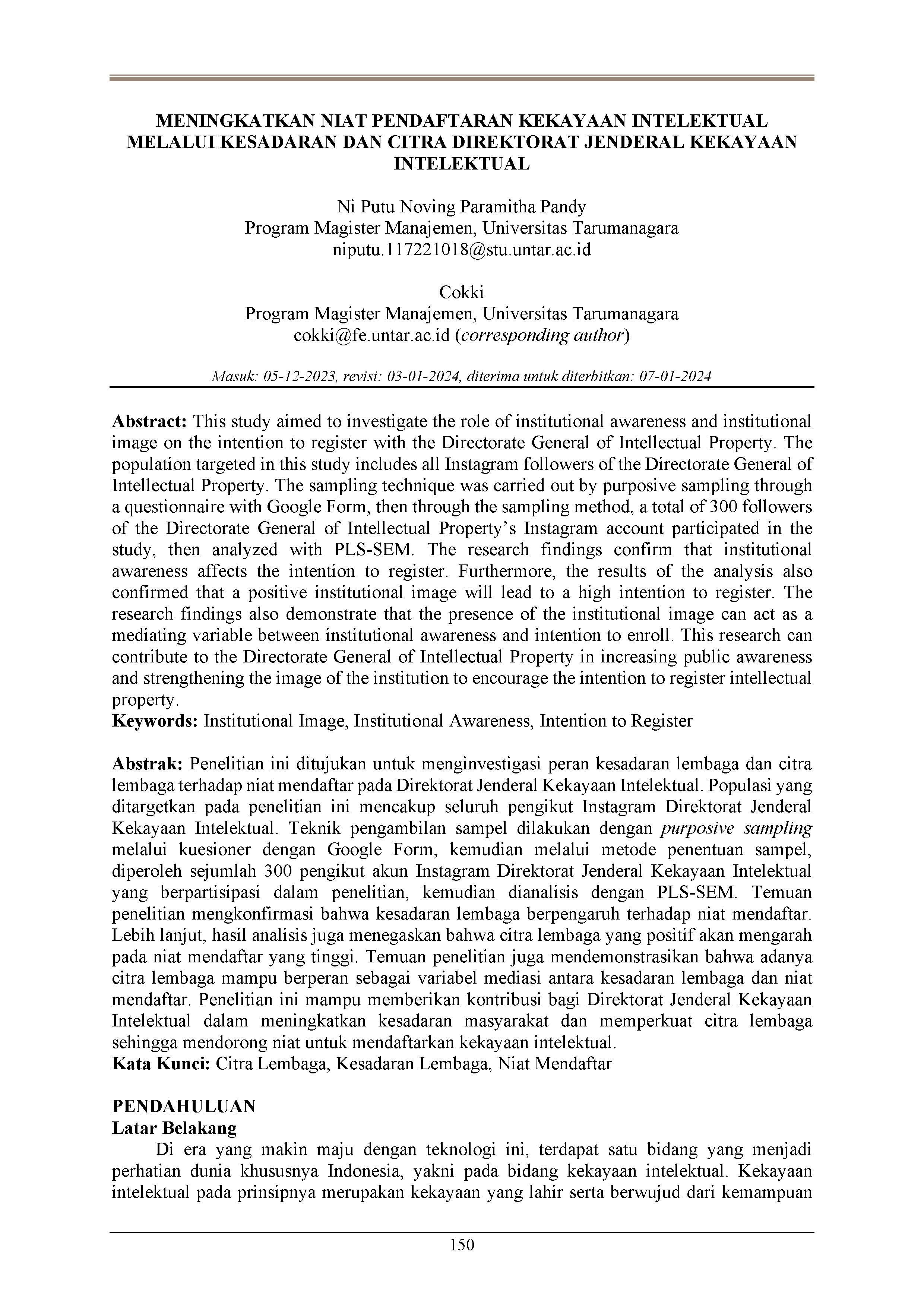 Penelitian ini ditujukan untuk menginvestigasi peran kesadaran lembaga dan citra lembaga terhadap niat mendaftar pada Direktorat Jenderal Kekayaan Intelektual. Populasi yang ditargetkan pada penelitian ini mencakup seluruh pengikut Instagram Direktorat Jenderal Kekayaan Intelektual. Teknik pengambilan sampel dilakukan dengan purposive sampling melalui kuesioner dengan Google Form, kemudian melalui metode penentuan sampel, diperoleh sejumlah 300 pengikut akun Instagram Direktorat Jenderal Kekayaan Intelektual yang berpartisipasi dalam penelitian, kemudian dianalisis dengan PLS-SEM. Temuan penelitian mengkonfirmasi bahwa kesadaran lembaga berpengaruh terhadap niat mendaftar. Lebih lanjut, hasil analisis juga menegaskan bahwa citra lembaga yang positif akan mengarah pada niat mendaftar yang tinggi. Temuan penelitian juga mendemonstrasikan bahwa adanya citra lembaga mampu berperan sebagai variabel mediasi antara kesadaran lembaga dan niat mendaftar. Penelitian ini mampu memberikan kontribusi bagi Direktorat Jenderal Kekayaan Intelektual dalam meningkatkan kesadaran masyarakat dan memperkuat citra lembaga sehingga mendorong niat untuk mendaftarkan kekayaan intelektual.