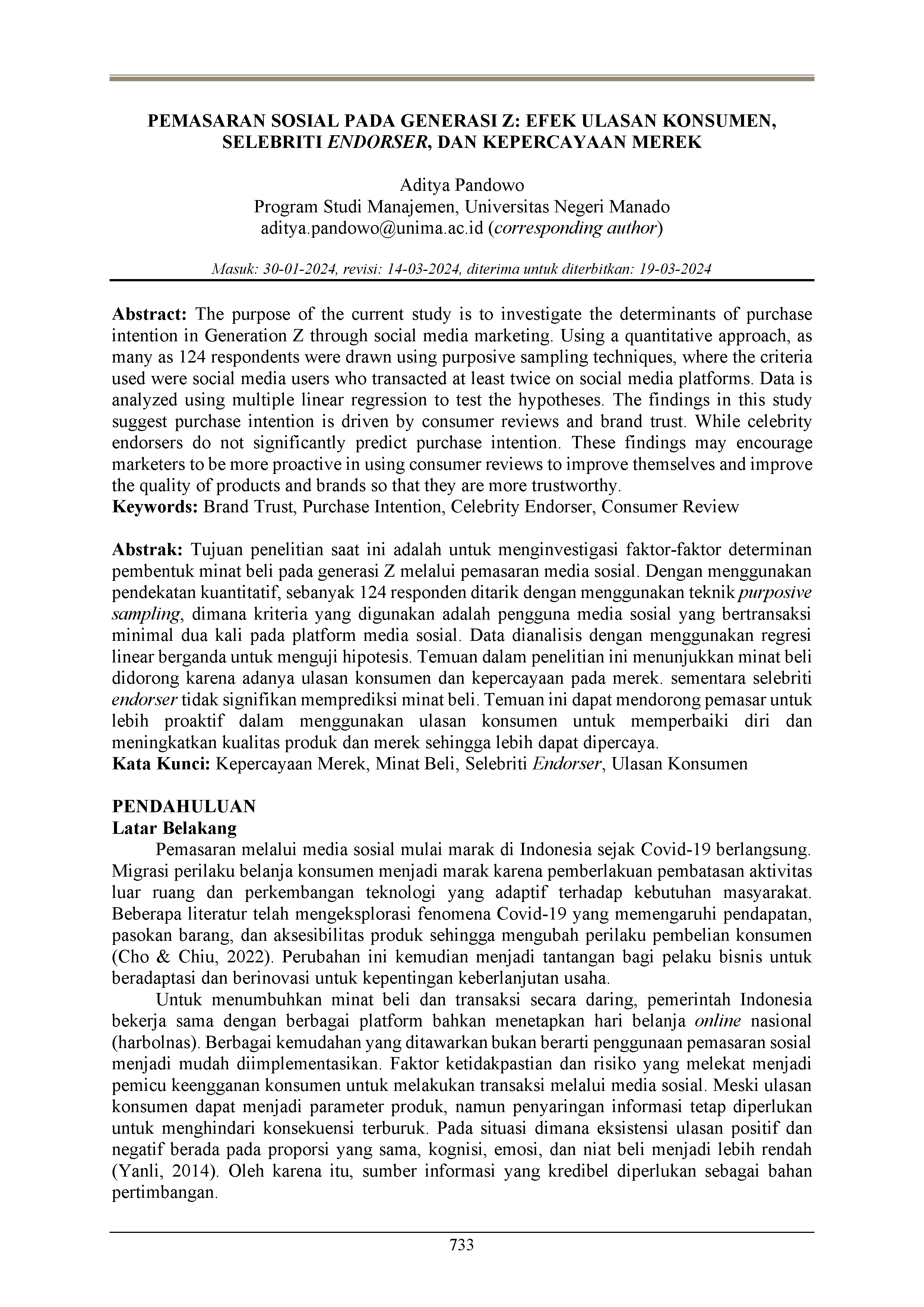 Pemasaran sosial pada Generasi Z: Efek ulasan konsumen, selebriti endorser, dan kepercayaan merek