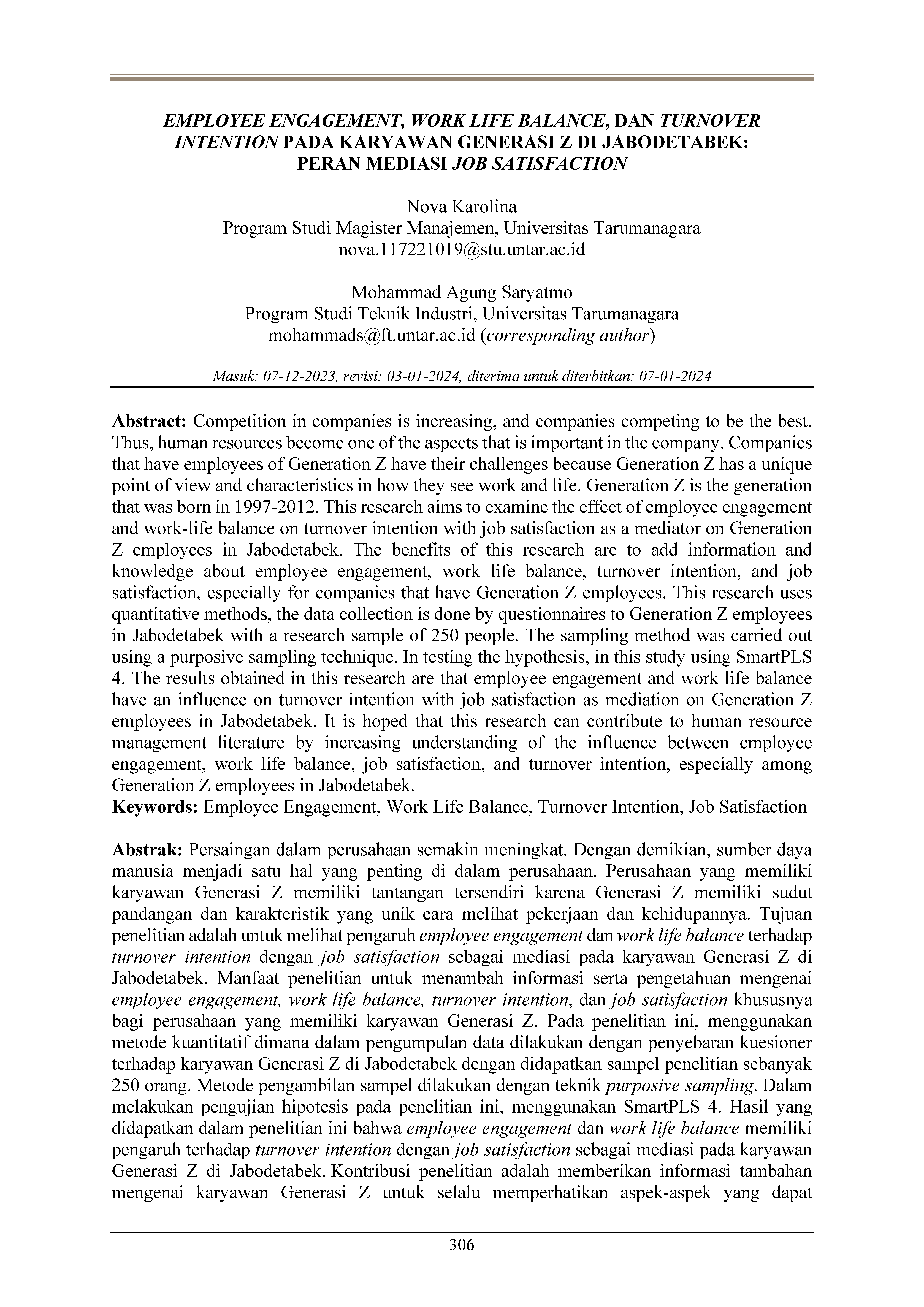 Persaingan dalam perusahaan semakin meningkat. Dengan demikian, sumber daya manusia menjadi satu hal yang penting di dalam perusahaan. Perusahaan yang memiliki karyawan Generasi Z memiliki tantangan tersendiri karena Generasi Z memiliki sudut pandangan dan karakteristik yang unik cara melihat pekerjaan dan kehidupannya. Tujuan penelitian adalah untuk melihat pengaruh employee engagement dan work life balance terhadap turnover intention dengan job satisfaction sebagai mediasi pada karyawan Generasi Z di Jabodetabek. Manfaat penelitian untuk menambah informasi serta pengetahuan mengenai employee engagement, work life balance, turnover intention, dan job satisfaction khususnya bagi perusahaan yang memiliki karyawan Generasi Z. Pada penelitian ini, menggunakan metode kuantitatif dimana dalam pengumpulan data dilakukan dengan penyebaran kuesioner terhadap karyawan Generasi Z di Jabodetabek dengan didapatkan sampel penelitian sebanyak 250 orang. Metode pengambilan sampel dilakukan dengan teknik purposive sampling. Dalam melakukan pengujian hipotesis pada penelitian ini, menggunakan SmartPLS 4. Hasil yang didapatkan dalam penelitian ini bahwa employee engagement dan work life balance memiliki pengaruh terhadap turnover intention dengan job satisfaction sebagai mediasi pada karyawan Generasi Z di Jabodetabek. Kontribusi penelitian adalah memberikan informasi tambahan mengenai karyawan Generasi Z untuk selalu memperhatikan aspek-aspek yang dapat memengaruhi turnover intention. Penelitian ini diharapkan dapat memberikan kontribusi pada literatur manajemen sumber daya manusia dengan menambah pemahaman tentang pengaruh antara employee engagement, work-life balance, job satisfaction, dan turnover intention, khususnya pada karyawan Generasi Z di konteks Jabodetabek.