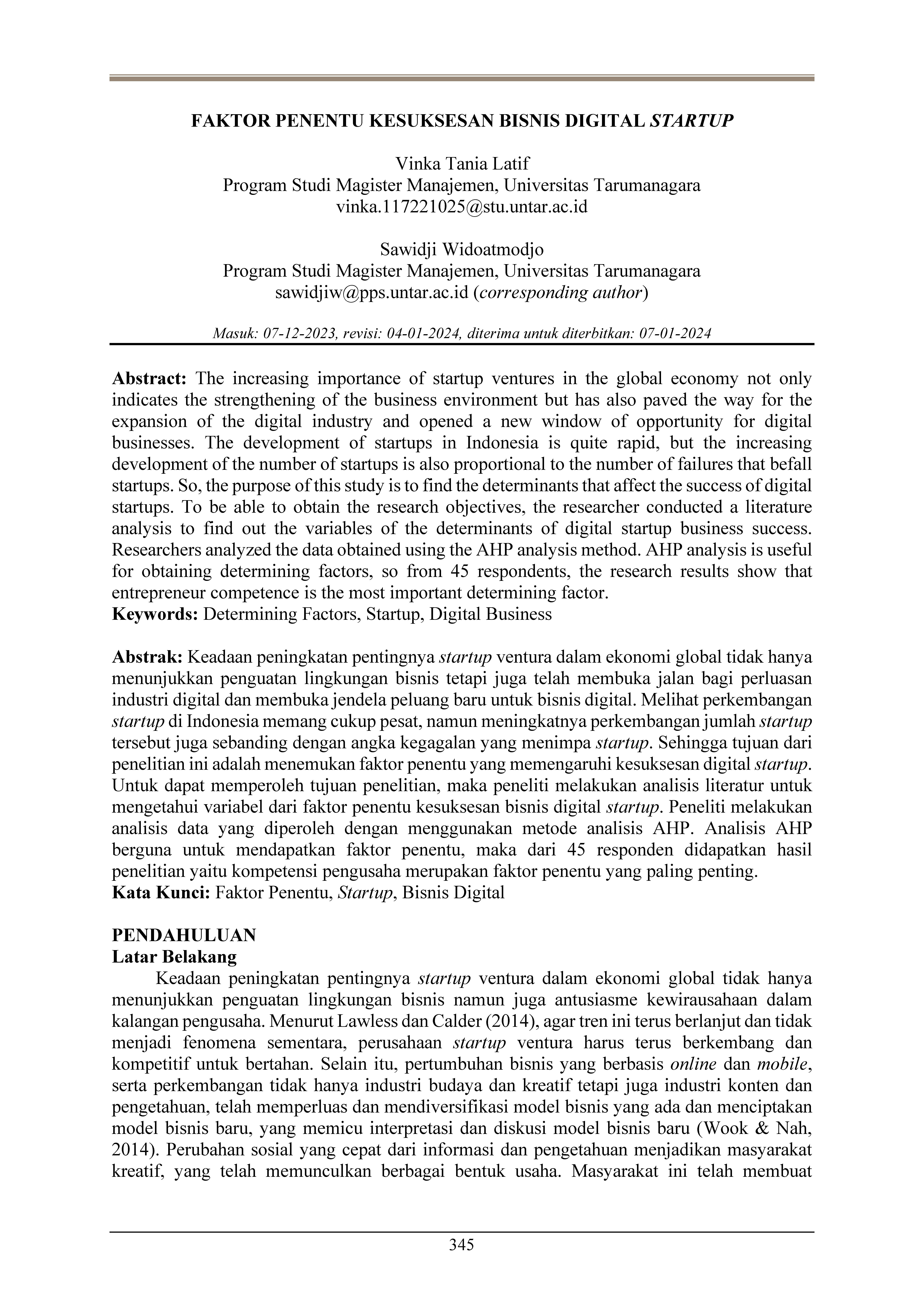 Keadaan peningkatan pentingnya startup ventura dalam ekonomi global tidak hanya menunjukkan penguatan lingkungan bisnis tetapi juga telah membuka jalan bagi perluasan industri digital dan membuka jendela peluang baru untuk bisnis digital. Melihat perkembangan startup di Indonesia memang cukup pesat, namun meningkatnya perkembangan jumlah startup tersebut juga sebanding dengan angka kegagalan yang menimpa startup. Sehingga tujuan dari penelitian ini adalah menemukan faktor penentu yang memengaruhi kesuksesan digital startup. Untuk dapat memperoleh tujuan penelitian, maka peneliti melakukan analisis literatur untuk mengetahui variabel dari faktor penentu kesuksesan bisnis digital startup. Peneliti melakukan analisis data yang diperoleh dengan menggunakan metode analisis AHP. Analisis AHP berguna untuk mendapatkan faktor penentu, maka dari 45 responden didapatkan hasil penelitian yaitu kompetensi pengusaha merupakan faktor penentu yang paling penting.