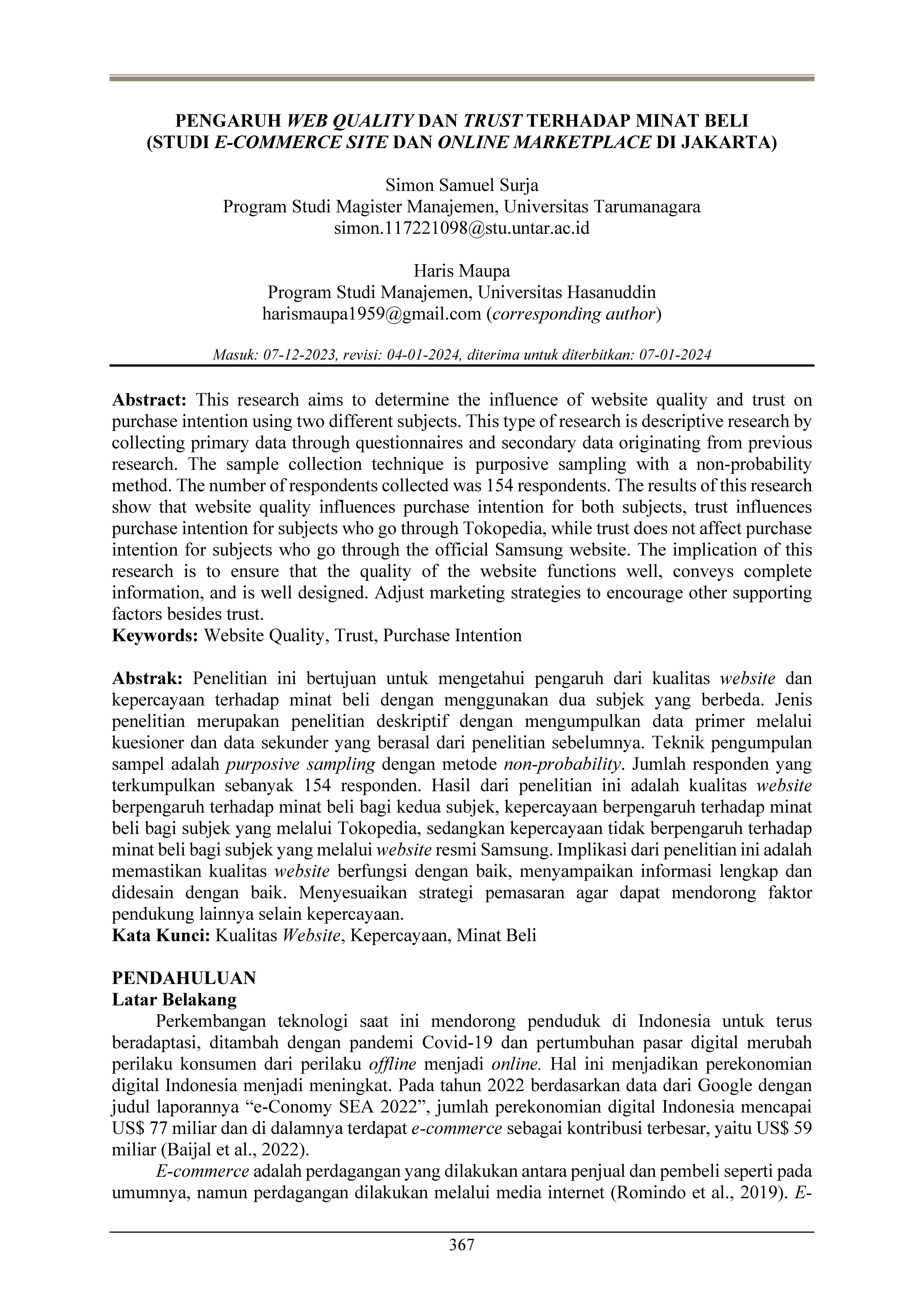 Surja, S. S., & Maupa, H. (2024). Pengaruh web quality dan trust terhadap minat beli (Studi e-commerce site dan online marketplace di Jakarta). Jurnal Manajemen Bisnis Dan Kewirausahaan, 8(2), 367–377. https://doi.org/10.24912/jmbk.v8i2.29667