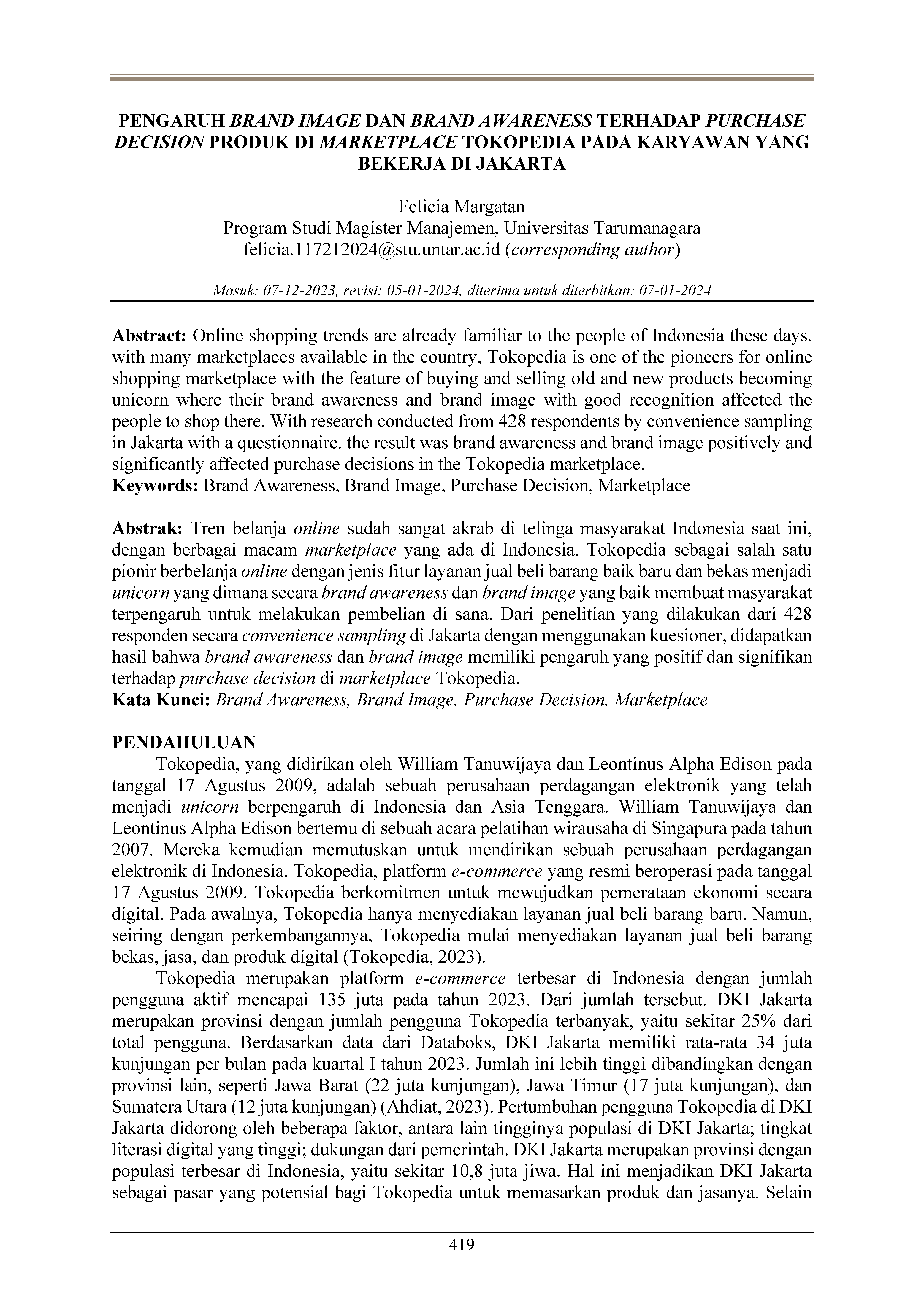 Tren belanja online sudah sangat akrab di telinga masyarakat Indonesia saat ini, dengan berbagai macam marketplace yang ada di Indonesia, Tokopedia sebagai salah satu pionir berbelanja online dengan jenis fitur layanan jual beli barang baik baru dan bekas menjadi unicorn yang dimana secara brand awareness dan brand image yang baik membuat masyarakat terpengaruh untuk melakukan pembelian di sana. Dari penelitian yang dilakukan dari 428 responden secara convenience sampling di Jakarta dengan menggunakan kuesioner, didapatkan hasil bahwa brand awareness dan brand image memiliki pengaruh yang positif dan signifikan terhadap purchase decision di marketplace Tokopedia.
