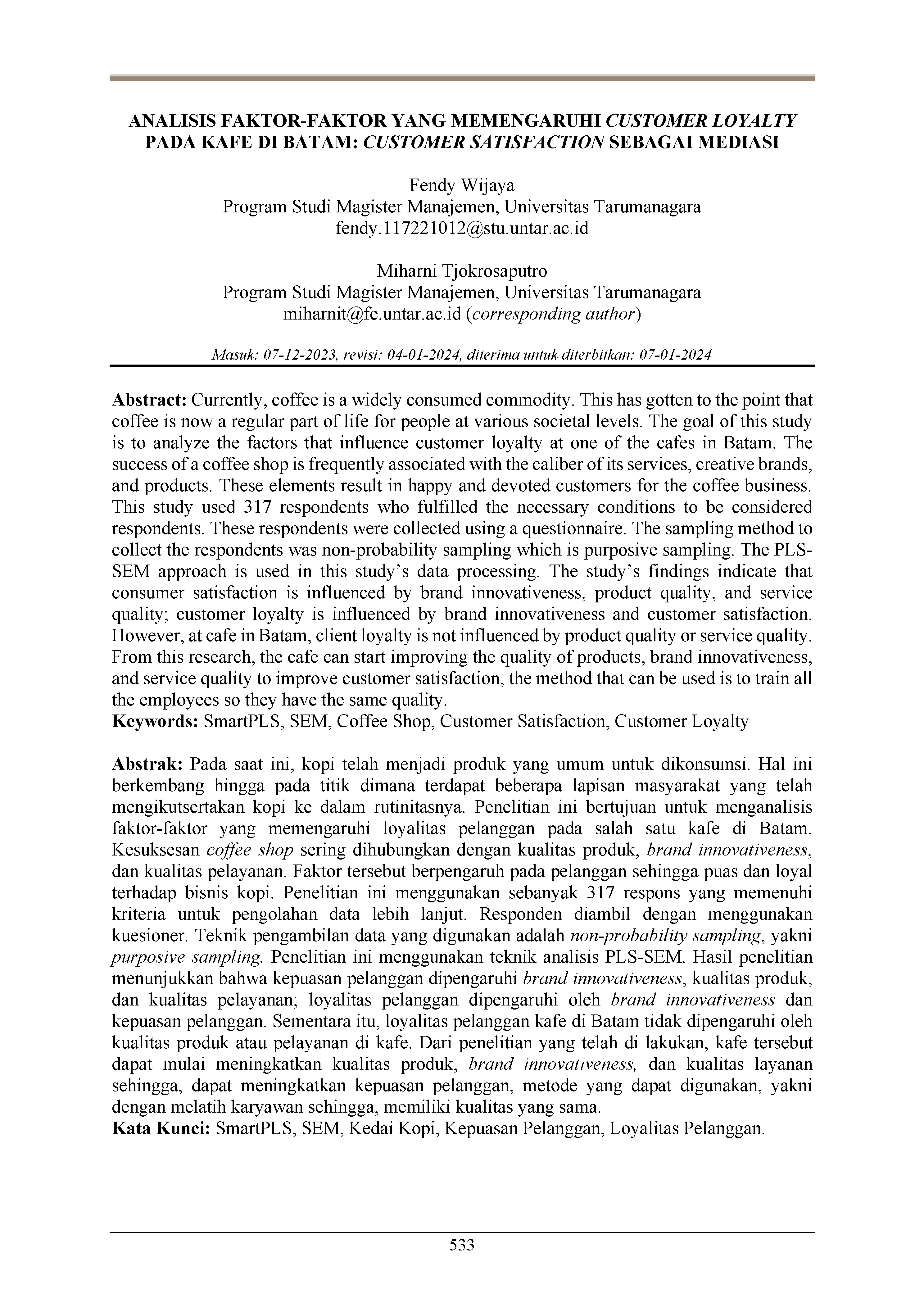 Pada saat ini, kopi telah menjadi produk yang umum untuk dikonsumsi. Hal ini berkembang hingga pada titik dimana terdapat beberapa lapisan masyarakat yang telah mengikutsertakan kopi ke dalam rutinitasnya. Penelitian ini bertujuan untuk menganalisis faktor-faktor yang memengaruhi loyalitas pelanggan pada salah satu kafe di Batam. Kesuksesan coffee shop sering dihubungkan dengan kualitas produk, brand innovativeness, dan kualitas pelayanan. Faktor tersebut berpengaruh pada pelanggan sehingga puas dan loyal terhadap bisnis kopi. Penelitian ini menggunakan sebanyak 317 respons yang memenuhi kriteria untuk pengolahan data lebih lanjut. Responden diambil dengan menggunakan kuesioner. Teknik pengambilan data yang digunakan adalah non-probability sampling, yakni purposive sampling. Penelitian ini menggunakan teknik analisis PLS-SEM. Hasil penelitian menunjukkan bahwa kepuasan pelanggan dipengaruhi brand innovativeness, kualitas produk, dan kualitas pelayanan; loyalitas pelanggan dipengaruhi oleh brand innovativeness dan kepuasan pelanggan. Sementara itu, loyalitas pelanggan kafe di Batam tidak dipengaruhi oleh kualitas produk atau pelayanan di kafe. Dari penelitian yang telah di lakukan, kafe tersebut dapat mulai meningkatkan kualitas produk, brand innovativeness, dan kualitas layanan sehingga, dapat meningkatkan kepuasan pelanggan, metode yang dapat digunakan, yakni dengan melatih karyawan sehingga, memiliki kualitas yang sama.