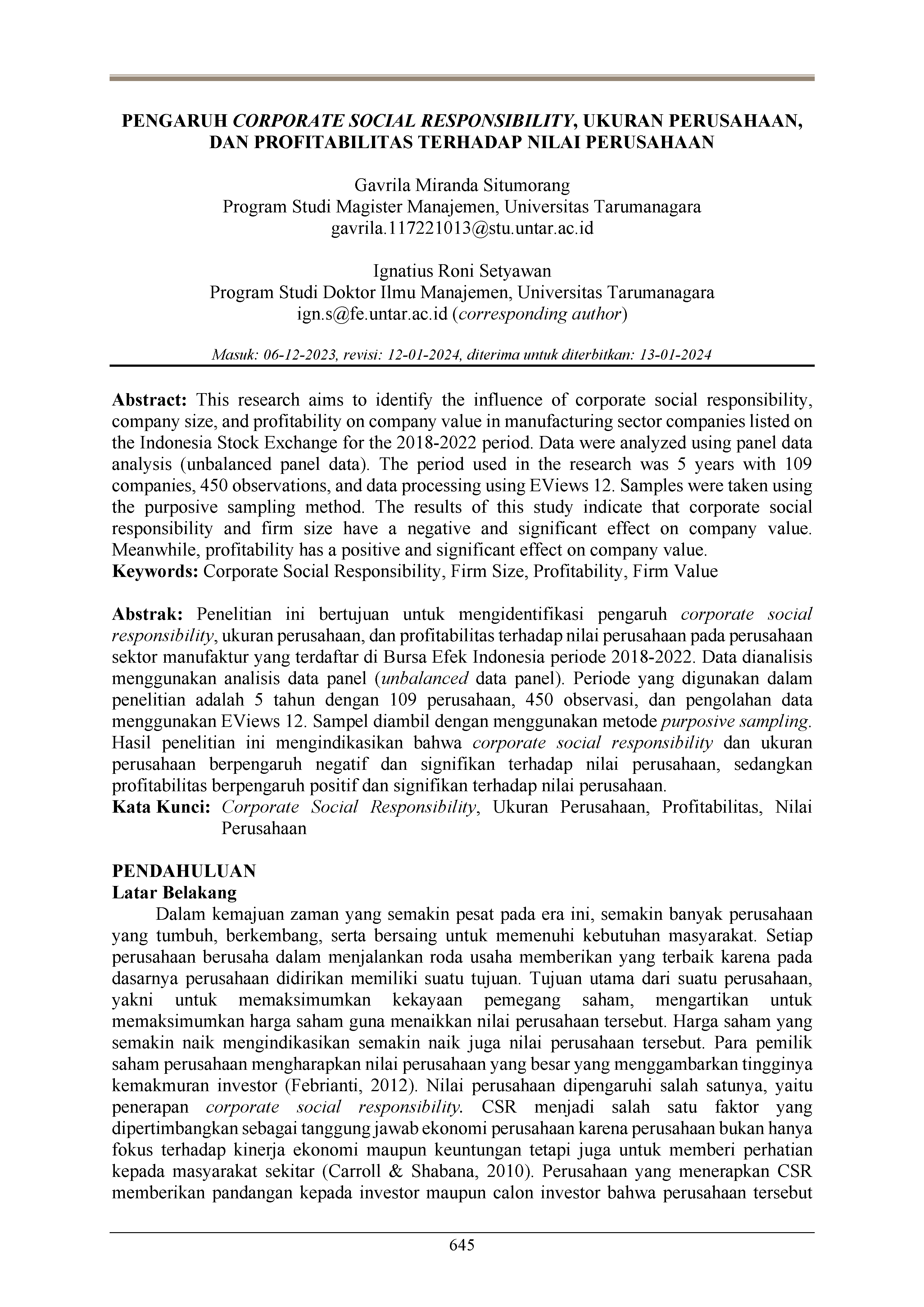 Situmorang, G. M., & Setyawan, I. R. (2024). Pengaruh corporate social responsibility, ukuran perusahaan, dan profitabilitas terhadap nilai perusahaan. Jurnal Manajemen Bisnis Dan Kewirausahaan, 8(3), 645–656. https://doi.org/10.24912/jmbk.v8i3.30225