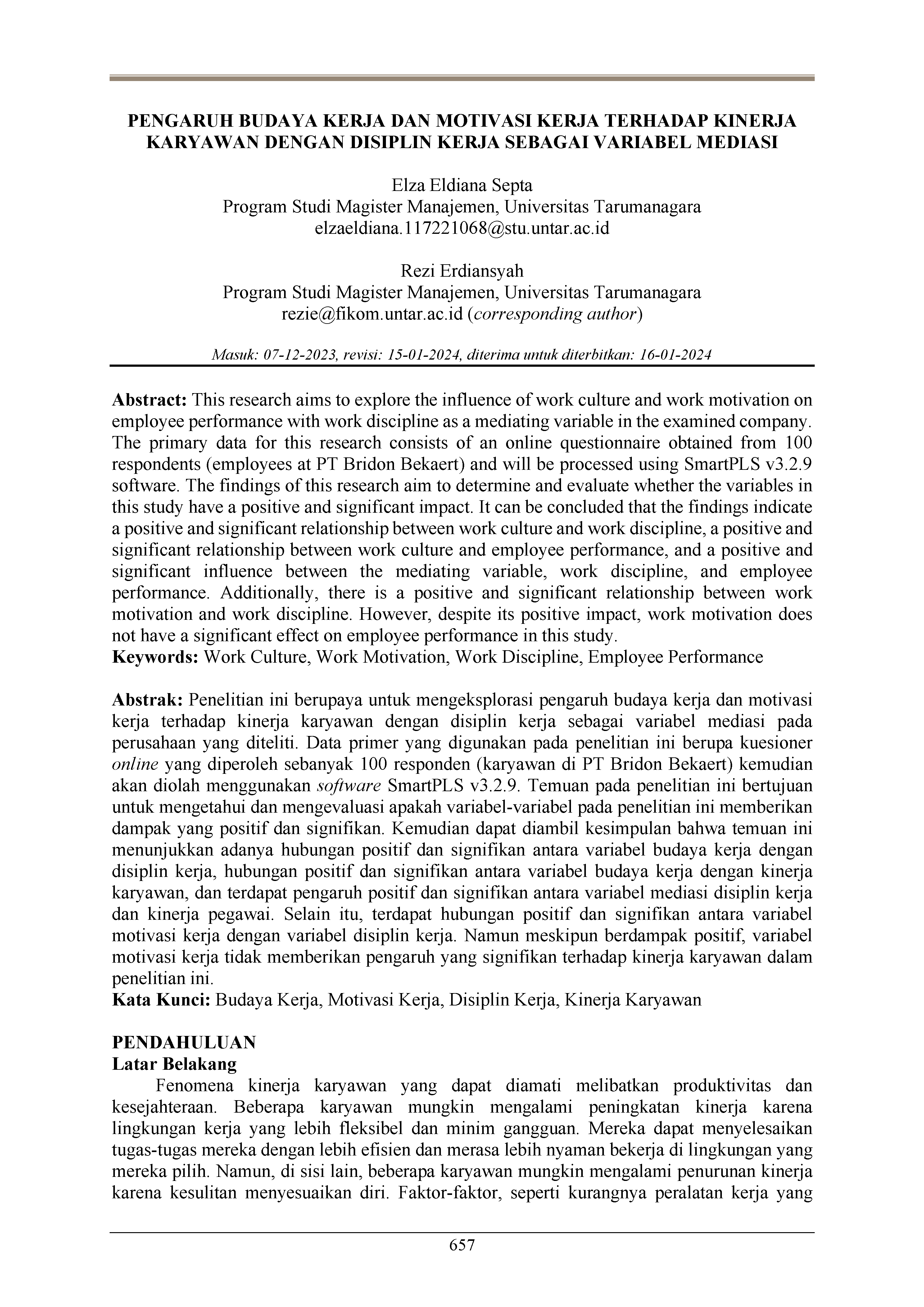 This research aims to explore the influence of work culture and work motivation on employee performance with work discipline as a mediating variable in the examined company. The primary data for this research consists of an online questionnaire obtained from 100 respondents (employees at PT Bridon Bekaert) and will be processed using SmartPLS v3.2.9 software. The findings of this research aim to determine and evaluate whether the variables in this study have a positive and significant impact. It can be concluded that the findings indicate a positive and significant relationship between work culture and work discipline, a positive and significant relationship between work culture and employee performance, and a positive and significant influence between the mediating variable, work discipline, and employee performance. Additionally, there is a positive and significant relationship between work motivation and work discipline. However, despite its positive impact, work motivation does not have a significant effect on employee performance in this study.