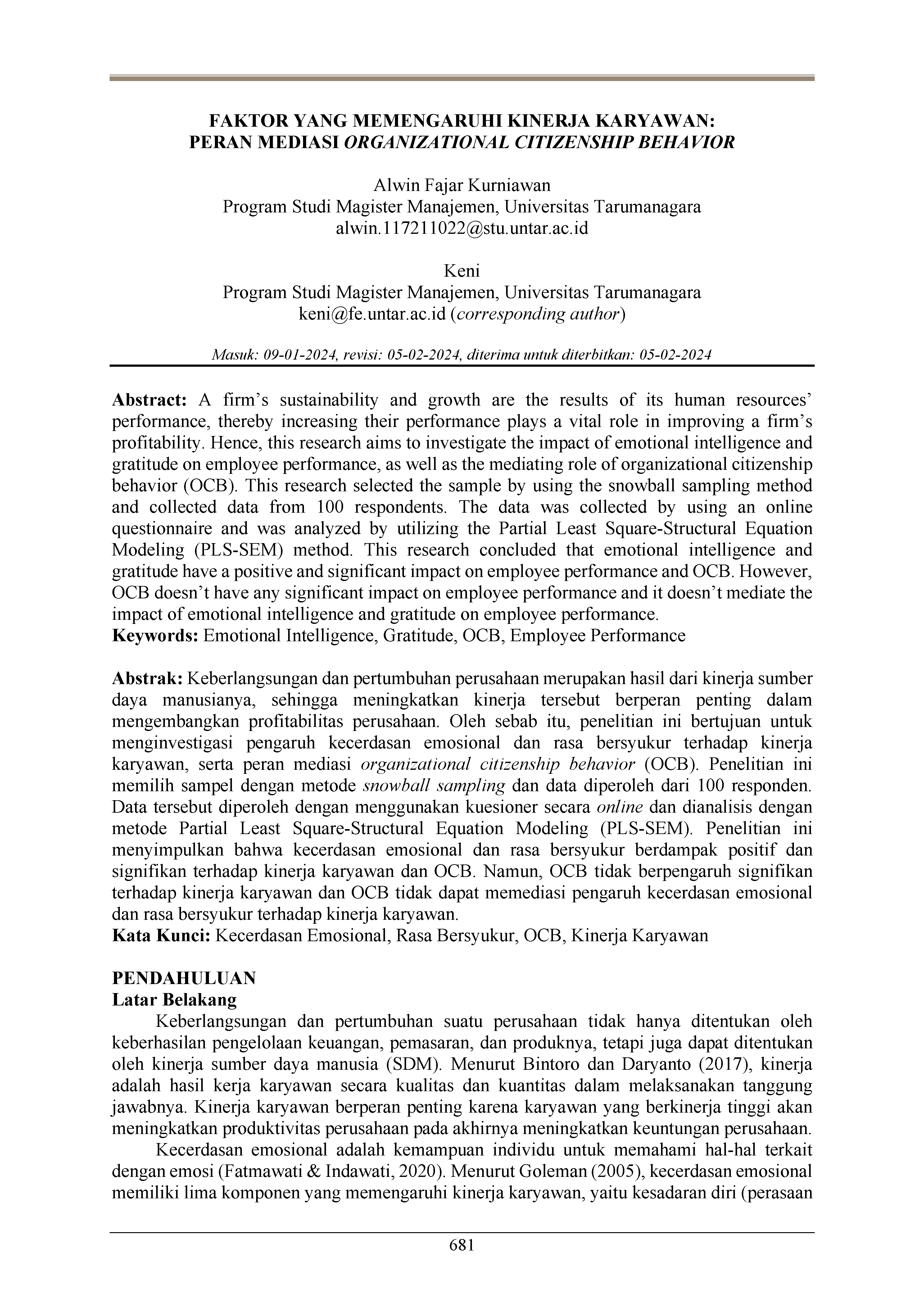 Keberlangsungan dan pertumbuhan perusahaan merupakan hasil dari kinerja sumber daya manusianya, sehingga meningkatkan kinerja tersebut berperan penting dalam mengembangkan profitabilitas perusahaan. Oleh sebab itu, penelitian ini bertujuan untuk menginvestigasi pengaruh kecerdasan emosional dan rasa bersyukur terhadap kinerja karyawan, serta peran mediasi organizational citizenship behavior (OCB). Penelitian ini memilih sampel dengan metode snowball sampling dan data diperoleh dari 100 responden. Data tersebut diperoleh dengan menggunakan kuesioner secara online dan dianalisis dengan metode Partial Least Square-Structural Equation Modeling (PLS-SEM). Penelitian ini menyimpulkan bahwa kecerdasan emosional dan rasa bersyukur berdampak positif dan signifikan terhadap kinerja karyawan dan OCB. Namun, OCB tidak berpengaruh signifikan terhadap kinerja karyawan dan OCB tidak dapat memediasi pengaruh kecerdasan emosional dan rasa bersyukur terhadap kinerja karyawan.