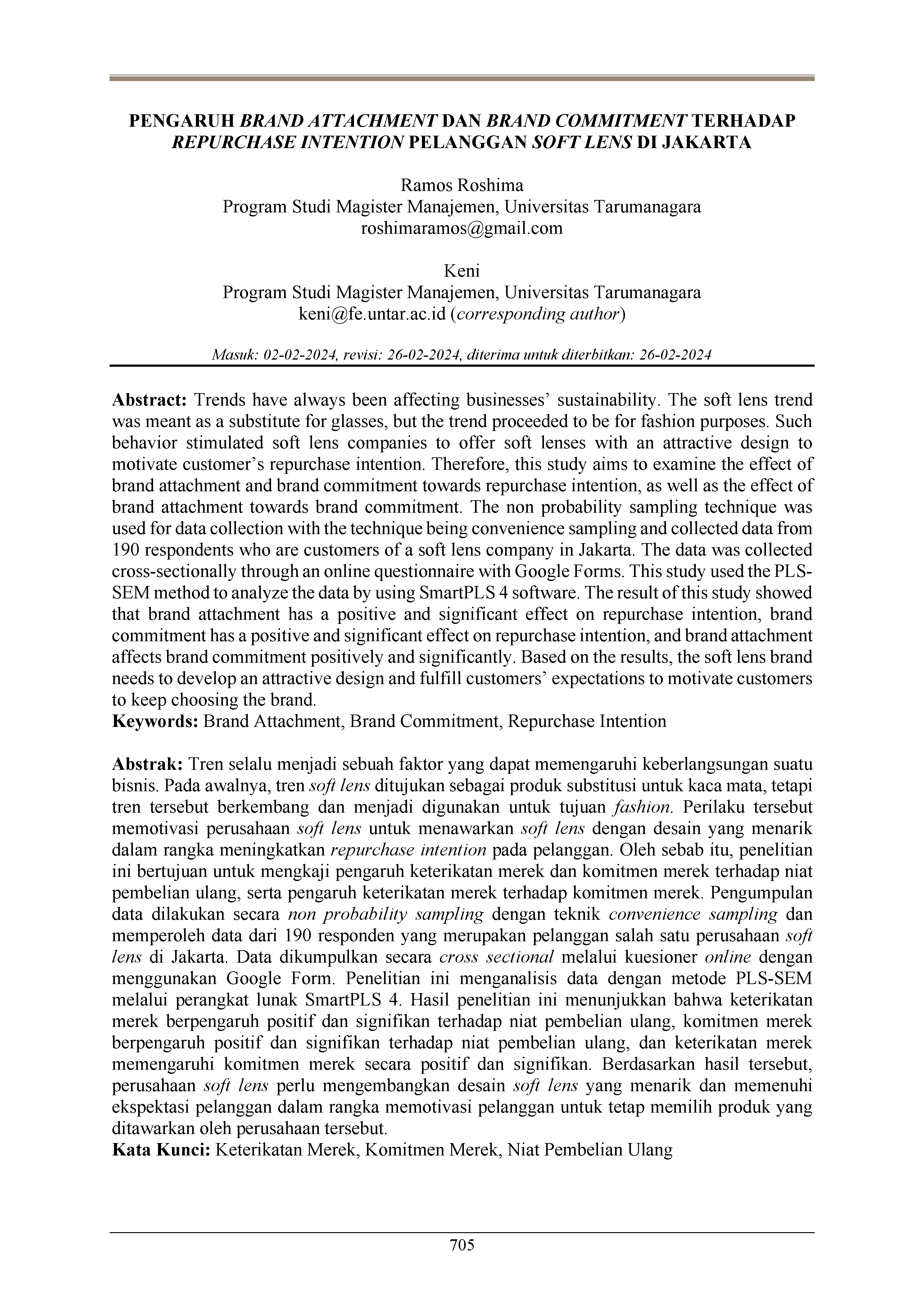 Pengaruh brand attachment dan brand commitment terhadap repurchase intention pelanggan soft lens di Jakarta