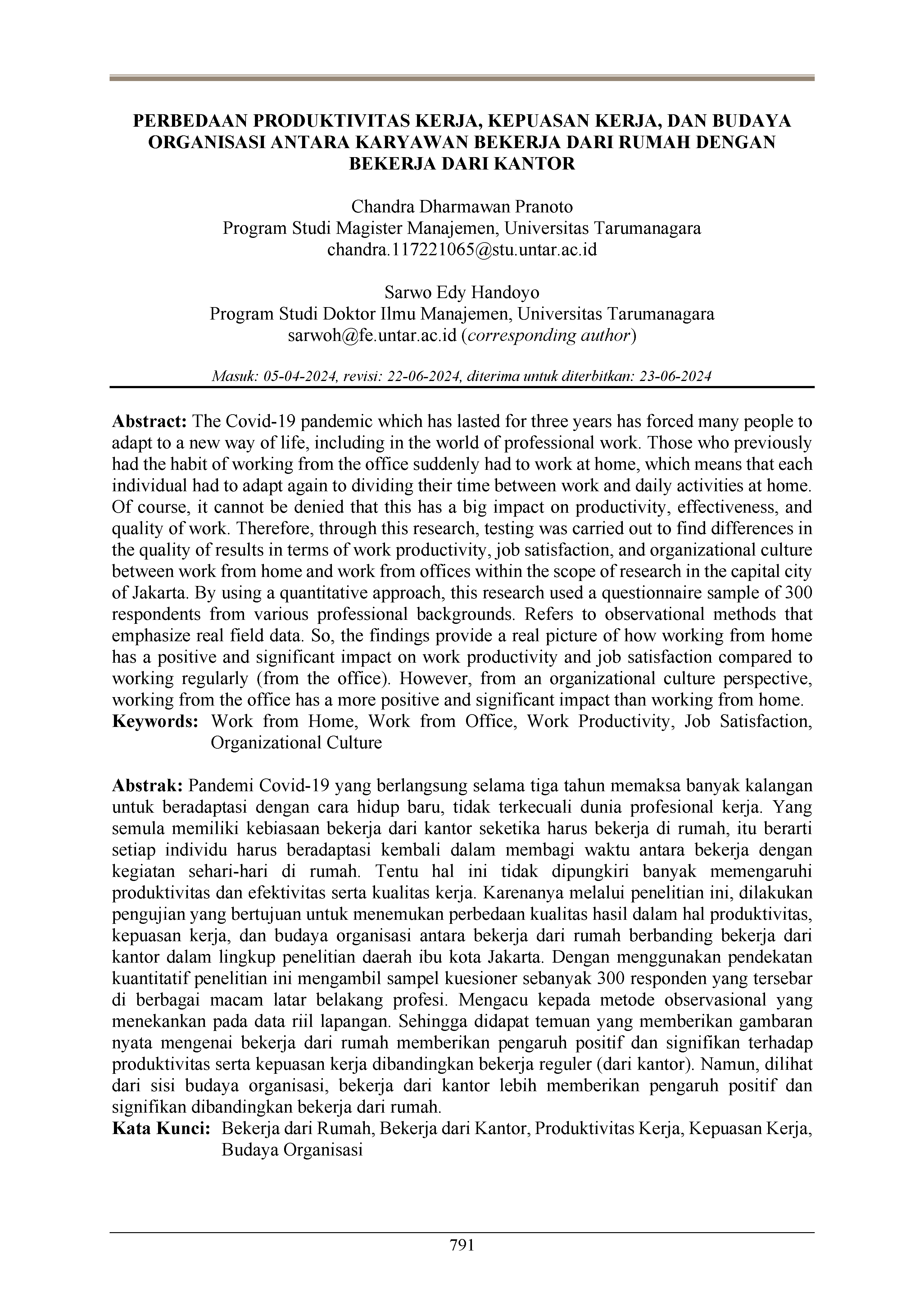 Pranoto, C. D., & Handoyo, S. E. (2024). Perbedaan produktivitas kerja, kepuasan kerja, dan budaya organisasi antara karyawan bekerja dari rumah dengan bekerja dari kantor. Jurnal Manajemen Bisnis Dan Kewirausahaan, 8(4), 791–801. https://doi.org/10.24912/jmbk.v8i4.31626