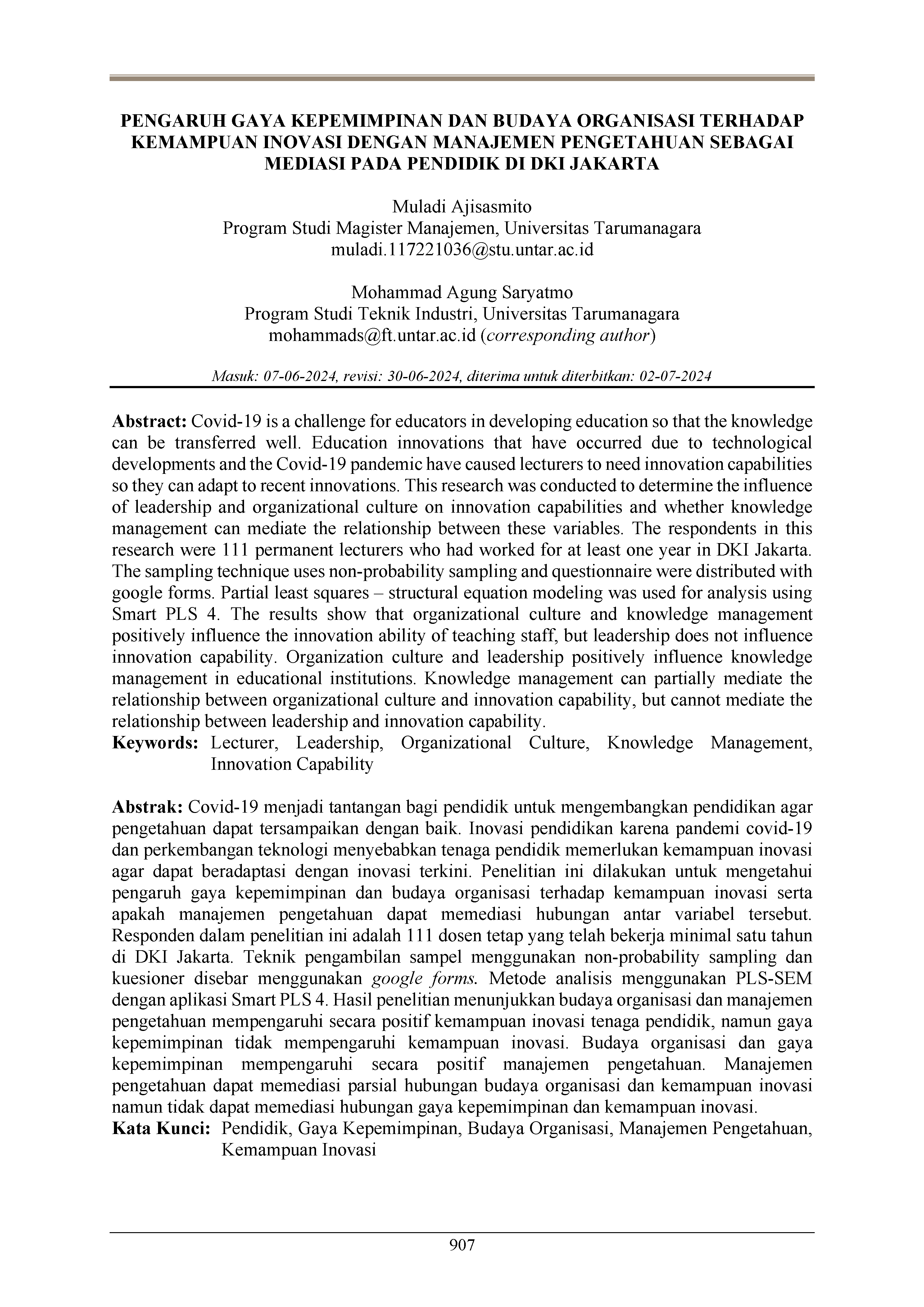 Pengaruh gaya kepemimpinan dan budaya organisasi terhadap kemampuan inovasi dengan manajemen pengetahuan sebagai mediasi pada pendidik di DKI Jakarta