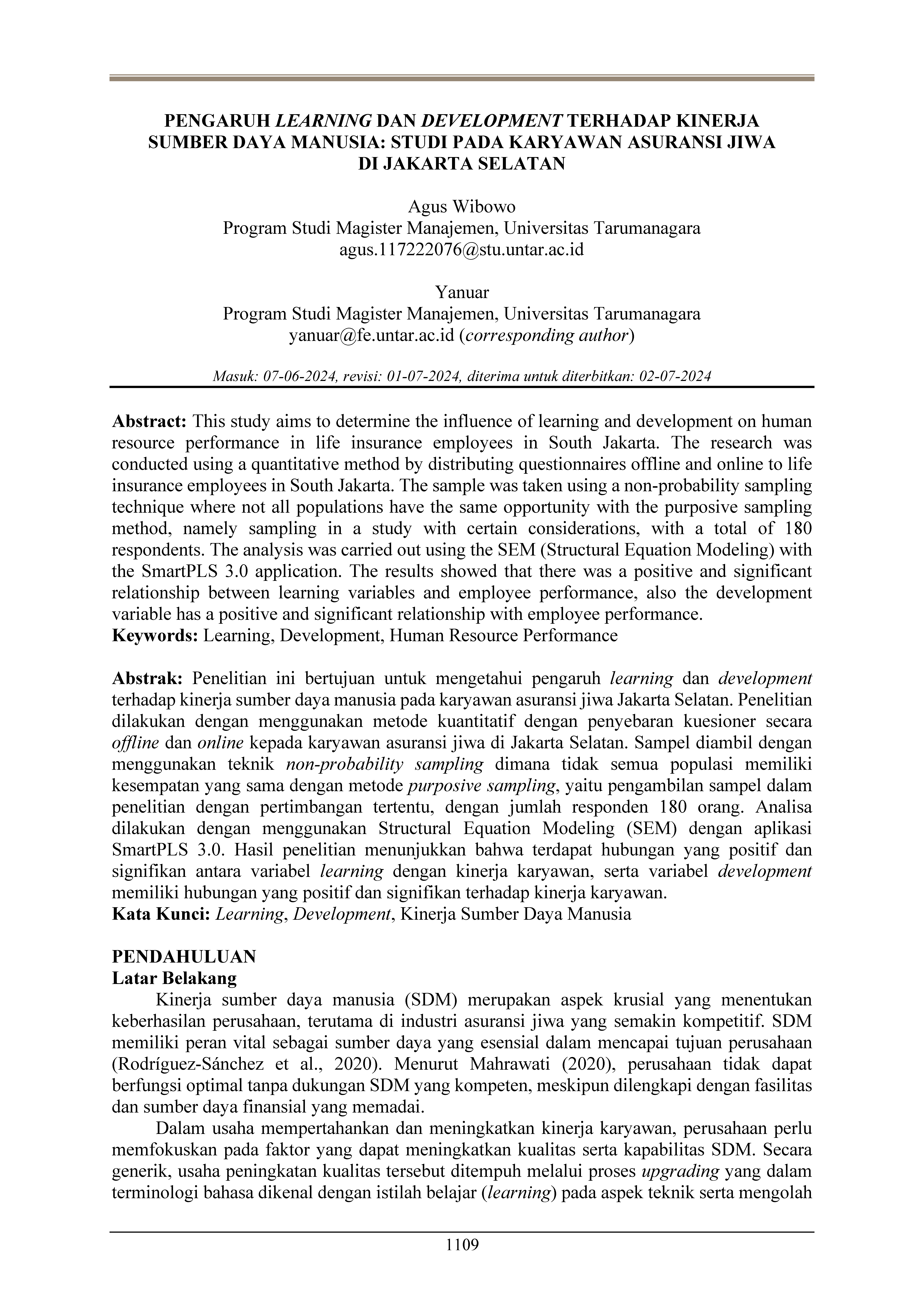 Penelitian ini bertujuan untuk mengetahui pengaruh learning dan development terhadap kinerja sumber daya manusia pada karyawan asuransi jiwa Jakarta Selatan. Penelitian dilakukan dengan menggunakan metode kuantitatif dengan penyebaran kuesioner secara offline dan online kepada karyawan asuransi jiwa di Jakarta Selatan. Sampel diambil dengan menggunakan teknik non-probability sampling dimana tidak semua populasi memiliki kesempatan yang sama dengan metode purposive sampling, yaitu pengambilan sampel dalam penelitian dengan pertimbangan tertentu, dengan jumlah responden 180 orang. Analisa dilakukan dengan menggunakan Structural Equation Modeling (SEM) dengan aplikasi SmartPLS 3.0. Hasil penelitian menunjukkan bahwa terdapat hubungan yang positif dan signifikan antara variabel learning dengan kinerja karyawan, serta variabel development memiliki hubungan yang positif dan signifikan terhadap kinerja karyawan.