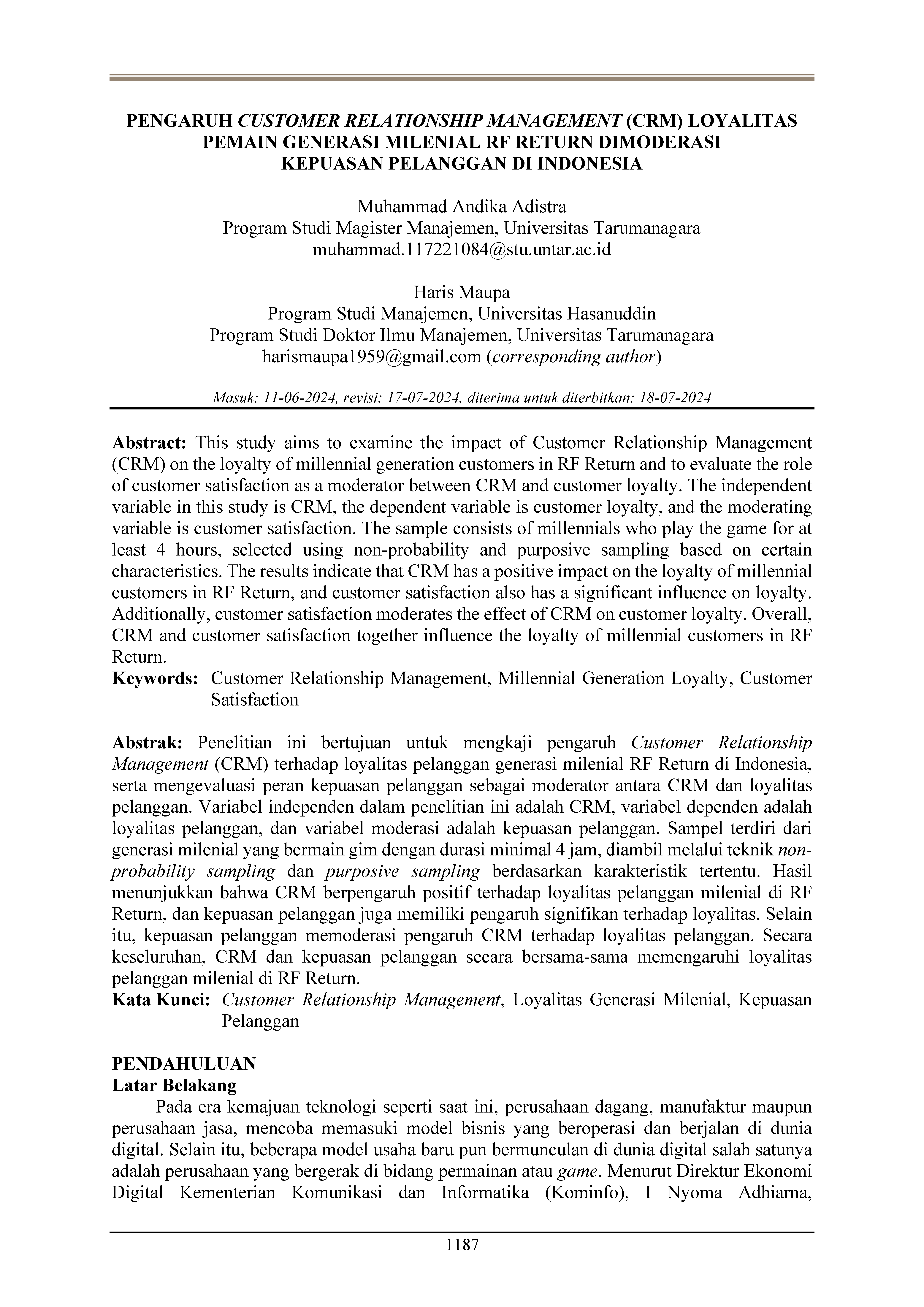 Penelitian ini bertujuan untuk mengkaji pengaruh Customer Relationship Management (CRM) terhadap loyalitas pelanggan generasi milenial RF Return di Indonesia, serta mengevaluasi peran kepuasan pelanggan sebagai moderator antara CRM dan loyalitas pelanggan. Variabel independen dalam penelitian ini adalah CRM, variabel dependen adalah loyalitas pelanggan, dan variabel moderasi adalah kepuasan pelanggan. Sampel terdiri dari generasi milenial yang bermain gim dengan durasi minimal 4 jam, diambil melalui teknik non-probability sampling dan purposive sampling berdasarkan karakteristik tertentu. Hasil menunjukkan bahwa CRM berpengaruh positif terhadap loyalitas pelanggan milenial di RF Return, dan kepuasan pelanggan juga memiliki pengaruh signifikan terhadap loyalitas. Selain itu, kepuasan pelanggan memoderasi pengaruh CRM terhadap loyalitas pelanggan. Secara keseluruhan, CRM dan kepuasan pelanggan secara bersama-sama memengaruhi loyalitas pelanggan milenial di RF Return.
