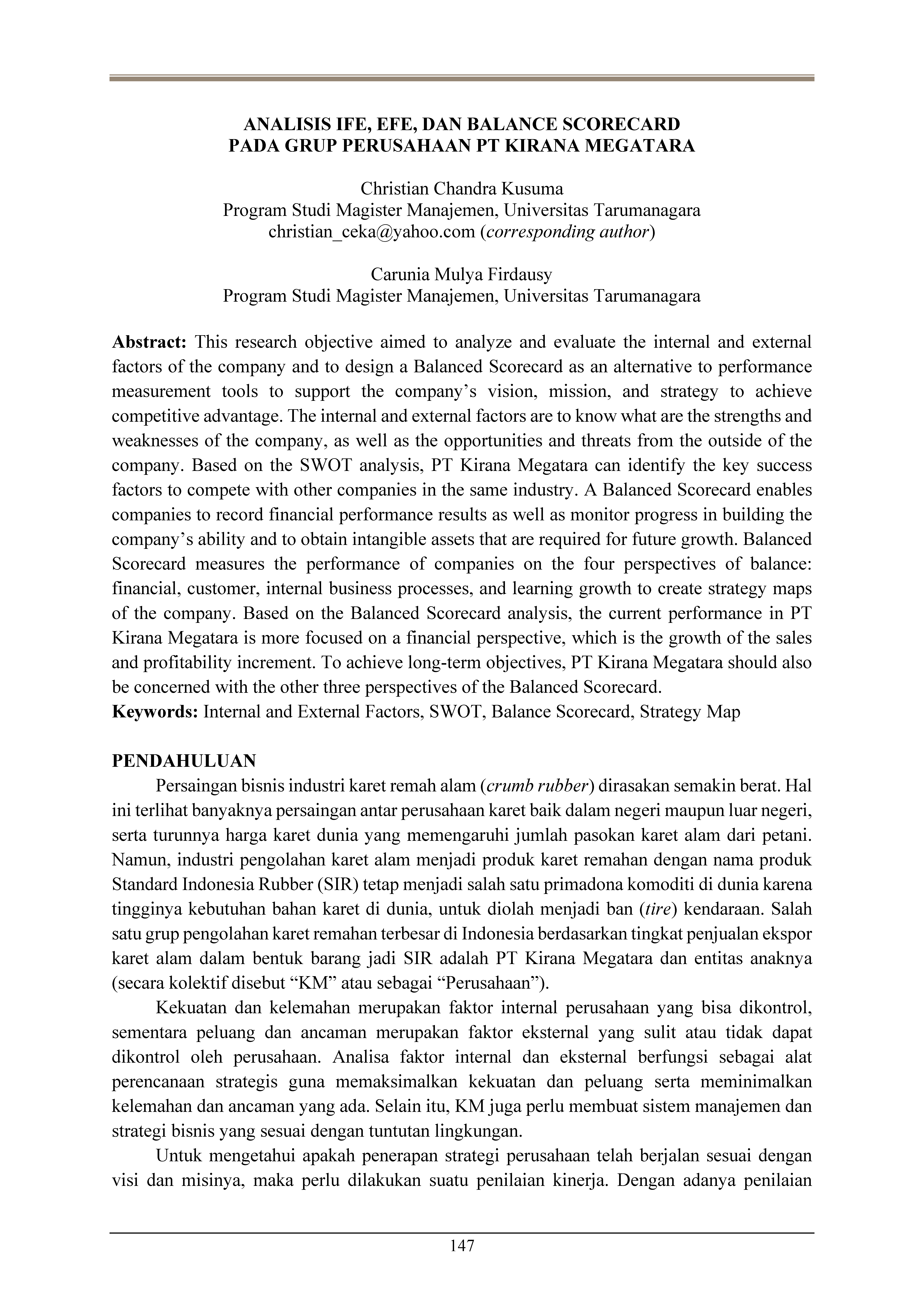 Analisis IFE, EFE, dan balance scorecard pada grup perusahaan PT Kirana Megatara