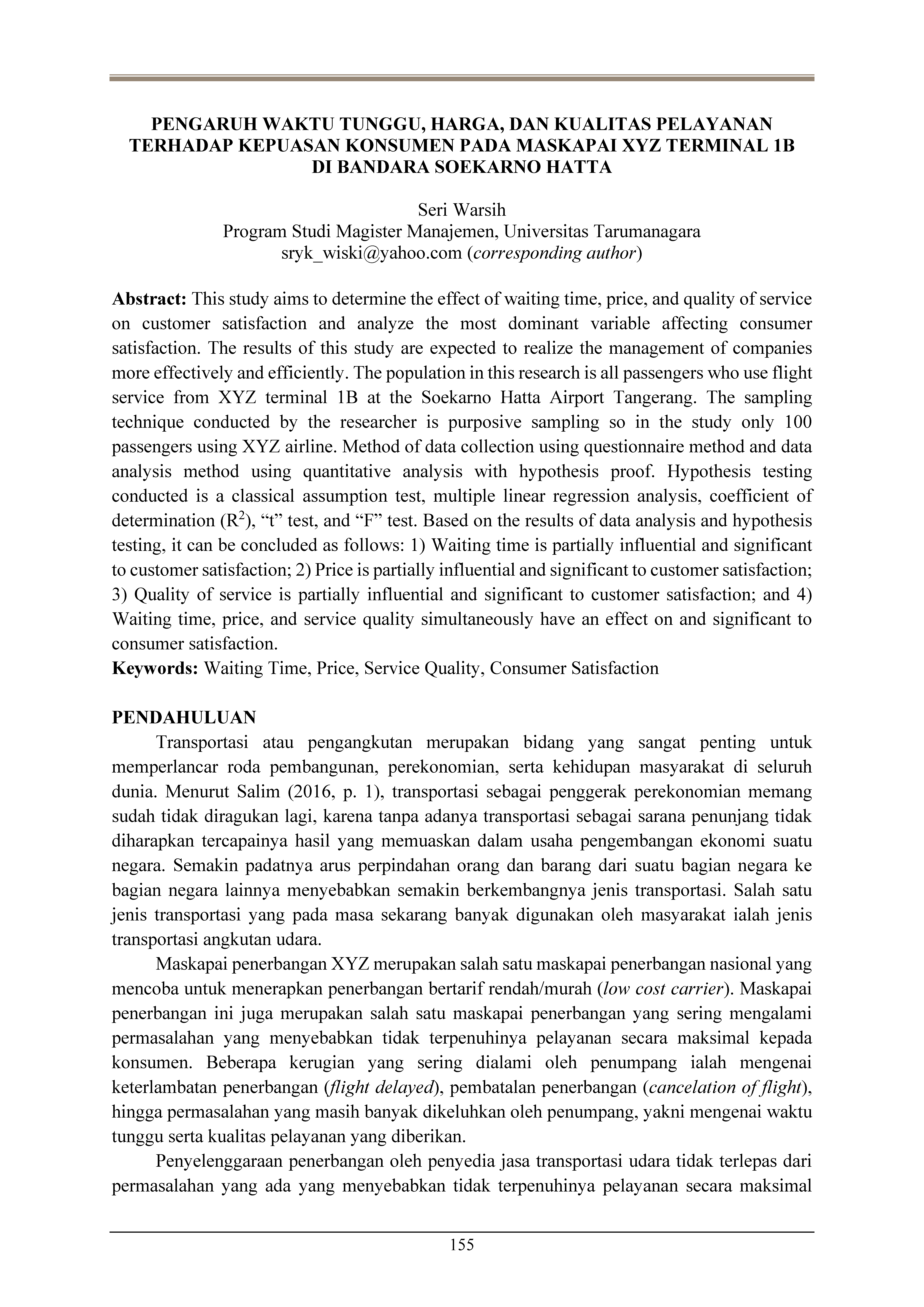 This study aims to determine the effect of waiting time, price, and quality of service on customer satisfaction and analyze the most dominant variable affecting consumer satisfaction. The results of this study are expected to realize the management of companies more effectively and efficiently. The population in this research is all passengers who use flight service from XYZ terminal 1B at the Soekarno Hatta Airport Tangerang. The sampling technique conducted by the researcher is purposive sampling so in the study only 100 passengers using XYZ airline. Method of data collection using questionnaire method and data analysis method using quantitative analysis with hypothesis proof. Hypothesis testing conducted is a classical assumption test, multiple linear regression analysis, coefficient of determination (R2), “t” test, and “F” test. Based on the results of data analysis and hypothesis testing, it can be concluded as follows: 1) Waiting time is partially influential and significant to customer satisfaction; 2) Price is partially influential and significant to customer satisfaction; 3) Quality of service is partially influential and significant to customer satisfaction; and 4) Waiting time, price, and service quality simultaneously have an effect on and significant to consumer satisfaction.