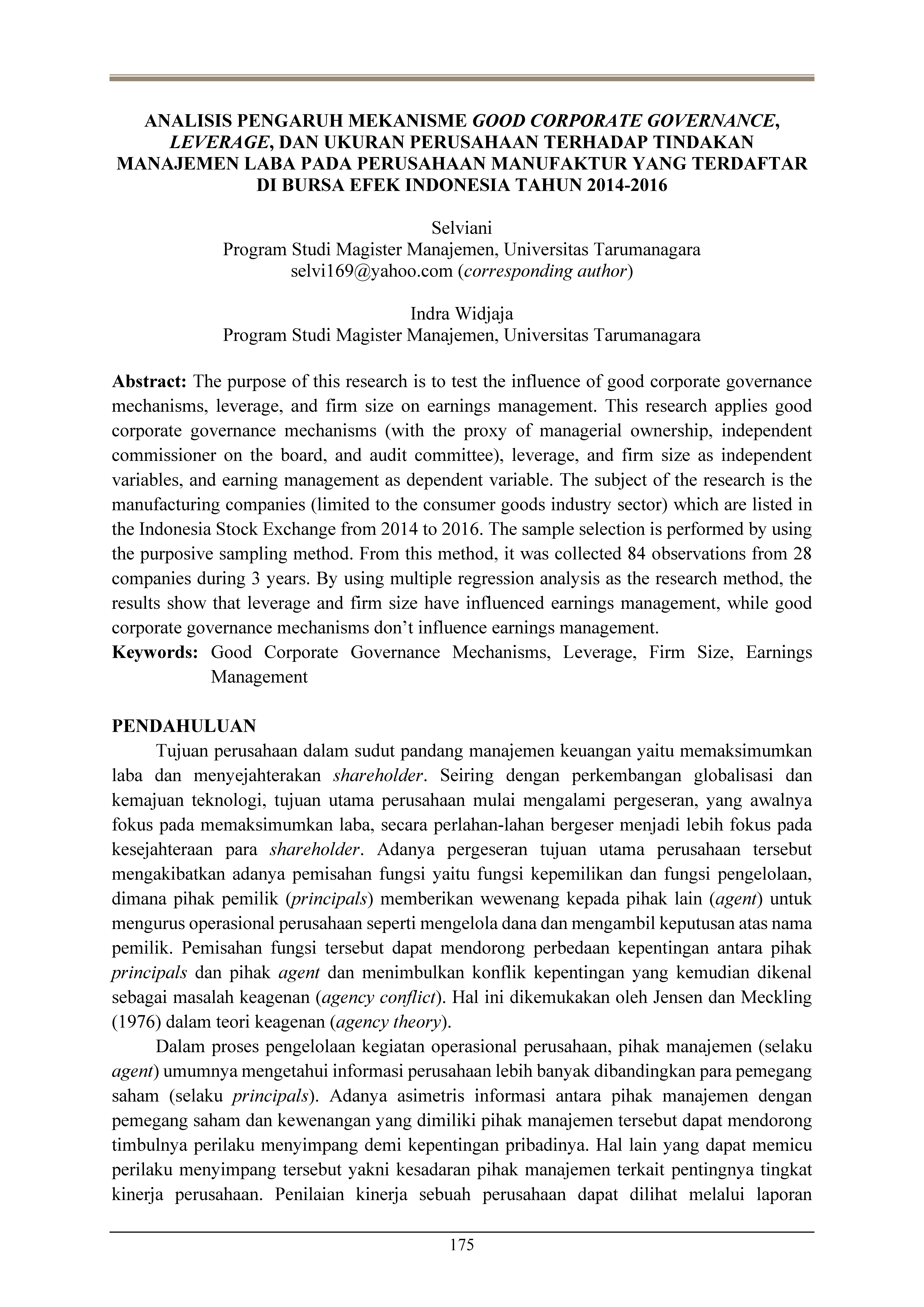 Analisis pengaruh mekanisme good corporate governance, leverage, dan ukuran perusahaan terhadap tindakan manajemen laba pada perusahaan manufaktur yang terdaftar di Bursa Efek Indonesia tahun 2014-2016