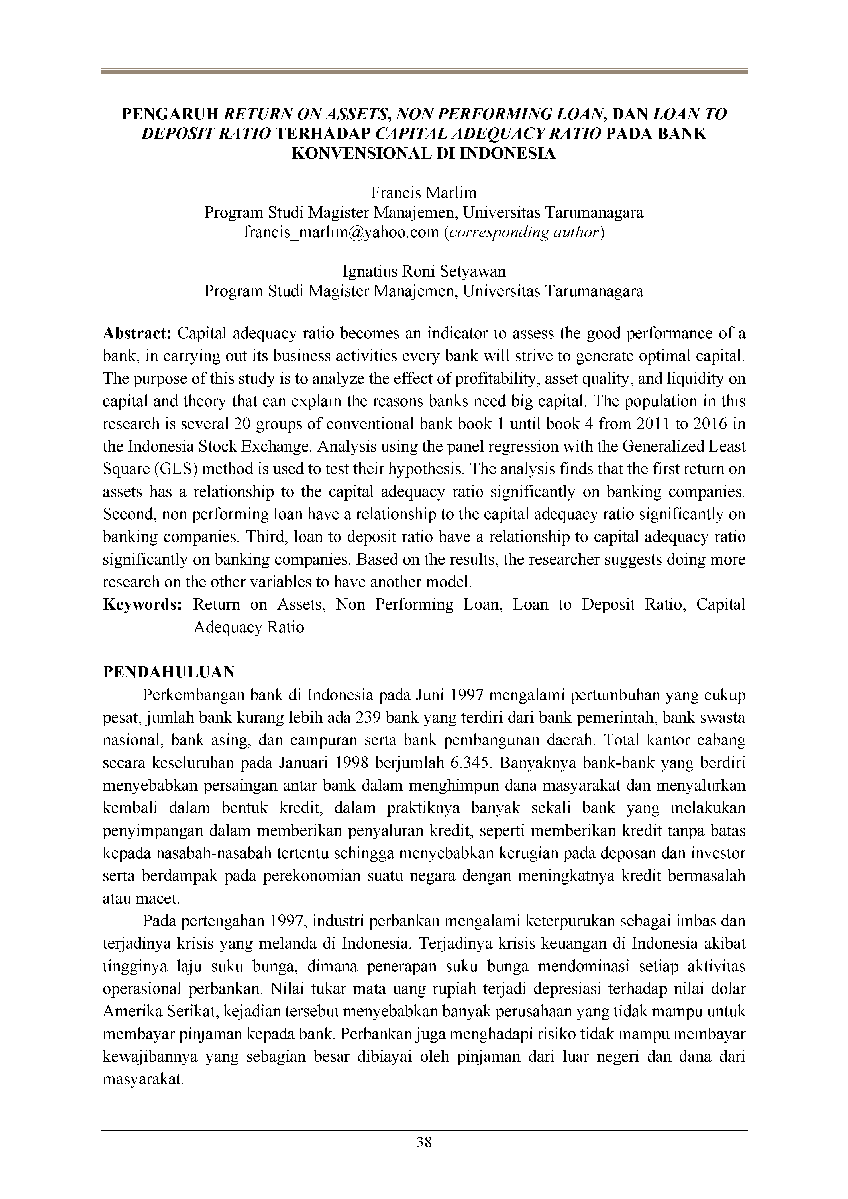 Pengaruh return on assets, non performing loan, dan loan to deposit ratio terhadap capital adequacy ratio pada bank konvensional di Indonesia