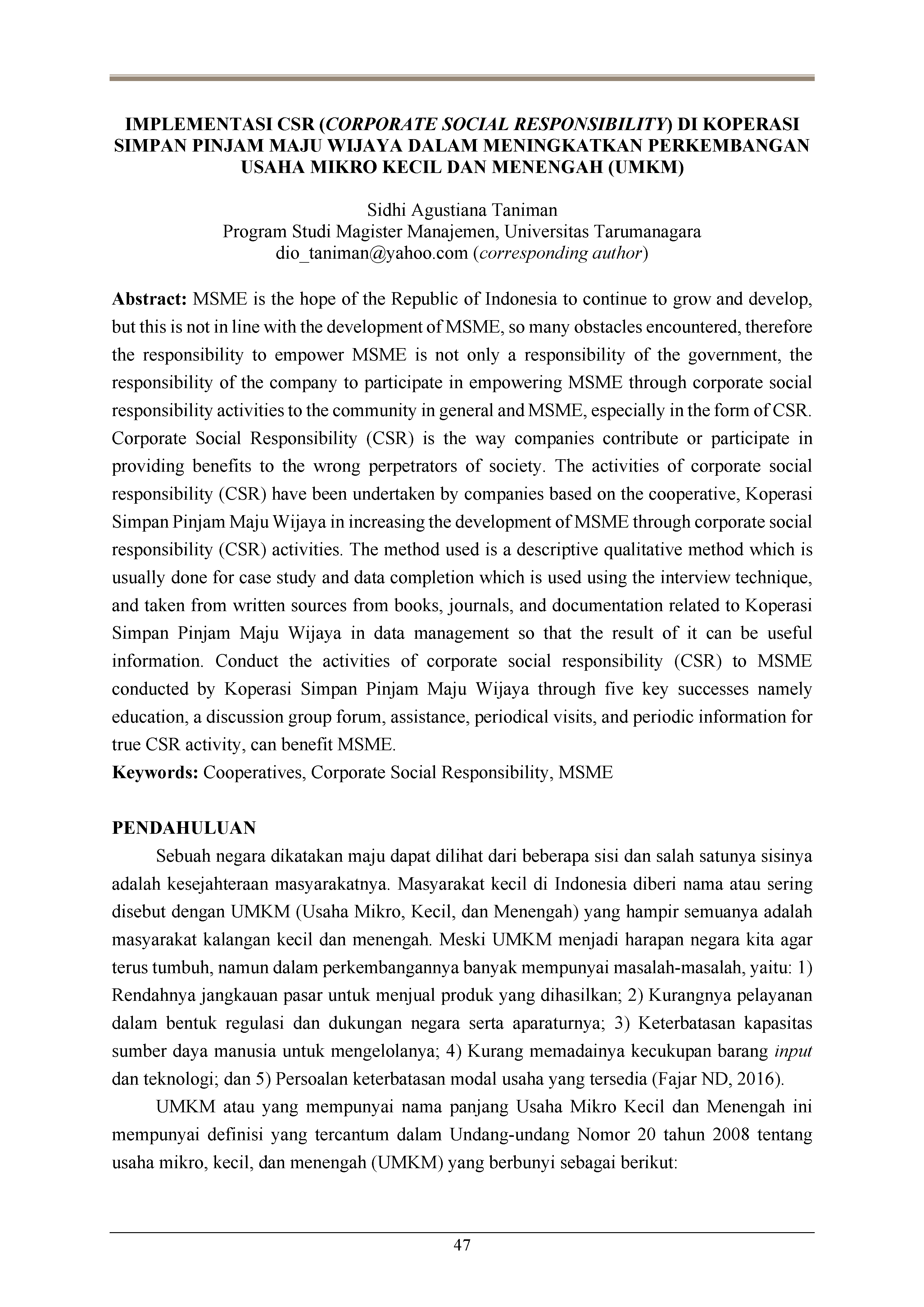 MSME is the hope of the Republic of Indonesia to continue to grow and develop, but this is not in line with the development of MSME, so many obstacles encountered, therefore the responsibility to empower MSME is not only a responsibility of the government, the responsibility of the company to participate in empowering MSME through corporate social responsibility activities to the community in general and MSME, especially in the form of CSR. Corporate Social Responsibility (CSR) is the way companies contribute or participate in providing benefits to the wrong perpetrators of society. The activities of corporate social responsibility (CSR) have been undertaken by companies based on the cooperative, Koperasi Simpan Pinjam Maju Wijaya in increasing the development of MSME through corporate social responsibility (CSR) activities. The method used is a descriptive qualitative method which is usually done for case study and data completion which is used using the interview technique, and taken from written sources from books, journals, and documentation related to Koperasi Simpan Pinjam Maju Wijaya in data management so that the result of it can be useful information. Conduct the activities of corporate social responsibility (CSR) to MSME conducted by Koperasi Simpan Pinjam Maju Wijaya through five key successes namely education, a discussion group forum, assistance, periodical visits, and periodic information for true CSR activity, can benefit MSME.