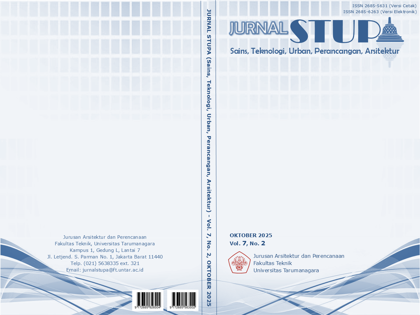 Jurnal Sains, Teknologi, Urban, Perancangan, Arsitektur (STUPA) merupakan Jurnal Ilmiah Jurusan Arsitektur dan Perencanaan, Fakultas Teknik, Universitas Tarumanagara dengan p-ISSN: 2685-5631 dan e-ISSN: 2685-6263 sebagai wadah publikasi artikel ilmiah dengan tema: Sains, Teknologi, Urban, Perancangan, Arsitektur (STUPA).