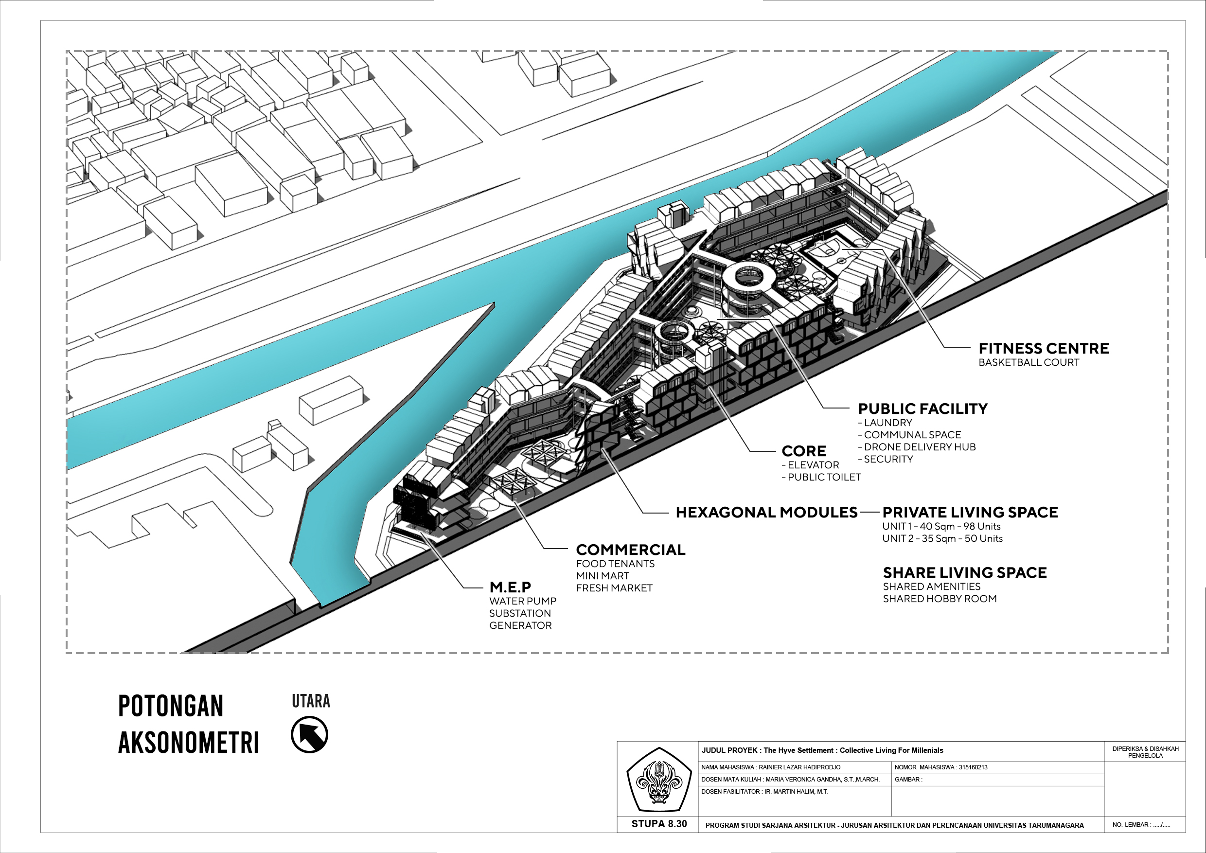 The millennial generation has a very wide and large opportunity and opportunity to innovate in this era. Therefore, this millennial generation is a great asset to realize national independence in all aspects. Currently the number is around 30% of the total population of Indonesia and is expected to continue to grow. It is predicted that the millennial generation will find it difficult to own a home in the next few years. Coupled with a pandemic that limits the movement of people. Therefore it is necessary to carry out in-depth research on the space requirements that are very much needed for millennials, so that they can create new parameters for housing specifically for millennials who have flexible and practical preferences. "The Hyve Settlement" project aims to provide efficient and affordable housing for Millennials. By presenting residential module units, and equipped with flexible and compact furniture so as to increase the space efficiency of the residence. As well as presenting communal living space to increase space efficiency and also create social development for other residents. Presenting supporting programs like public facilities to improve the quality of life for residents.