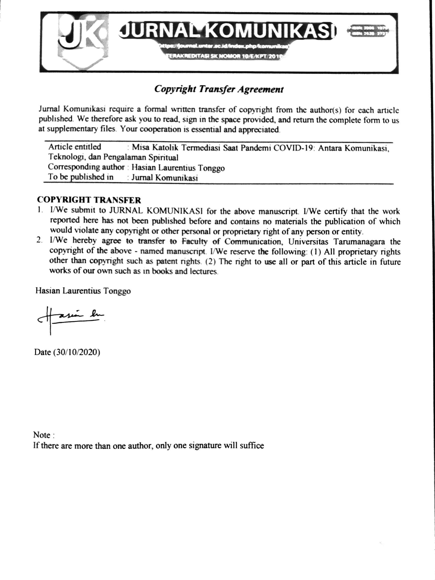 Pandemi COVID-19 membuat gereja Katolik di Indonesia melakukan physical distancing bahkan menutup pintunya dan mengalihkan misa ke media daring atau televisi. Keadaan ini merupakan sesuatu yang luar biasa bagi gereja Katolik yang terkenal memegang teguh tradisi dalam pelaksanaan ibadahnya. Penelitian ini memiliki tujuan yaitu ingin mengetahui pengalaman umat Katolik dalam melakukan ibadah termediasi dengan menggunakan Religious-Social Shaping of Technology serta beberapa konsep lain, yaitu social affordance, religion-online/online-religion, dan hukum media digital. Adapun pelaksanaan penelitian kualitatif ini adalah dengan mewawancarai enam informan menggunakan pendekatan fenomenologi deskriptif. Hasil penelitian ini menunjukkan empat temuan utama. Pertama, informan memiliki kebebasan untuk memilih alat maupun kanal untuk mengikuti misa termediasi. Kedua, interaktivitas dalam misa termediasi menjadi hilang. Ketiga, suasana misa termediasi bisa berdampak pada kekhusyukan saat beribadah. Keempat, pemanfaatan teknologi untuk misa termediasi memang tidak bisa mutlak disejajarkan dengan ibadah fisik namun sebagian informan tetap mengharapkan misa termediasi dilakukan setelah masa pandemi ini. Penelitian ini menyimpulkan bahwa misa termediasi selama pandemi memang tidak seideal misa fisik karena pengalaman yang diraih tidaklah maksimal, namun membuka peluang lebih luas untuk menjangkau orang-orang yang tidak mungkin hadir secara fisik di gereja dari mana saja.Secara akademis penelitian ini diharapakan dapat meningkatkan khazanah pengetahuan tentang ibadah termediasi pada saat pandemi. Sementara secara praktis, penelitian ini dapat menjadi acuan bagi gereja untuk meningkatkan kualitas secara menyeluruh.